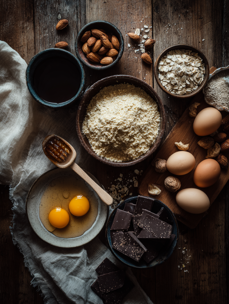 - Farine d’amande (IG ~15) — texture fondante, protéines végétales, bons lipides, naturellement sans gluten. C’est la base qui change tout.