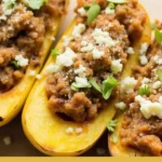 - Remplissez les moitiés de la courge avec la garniture préparée.