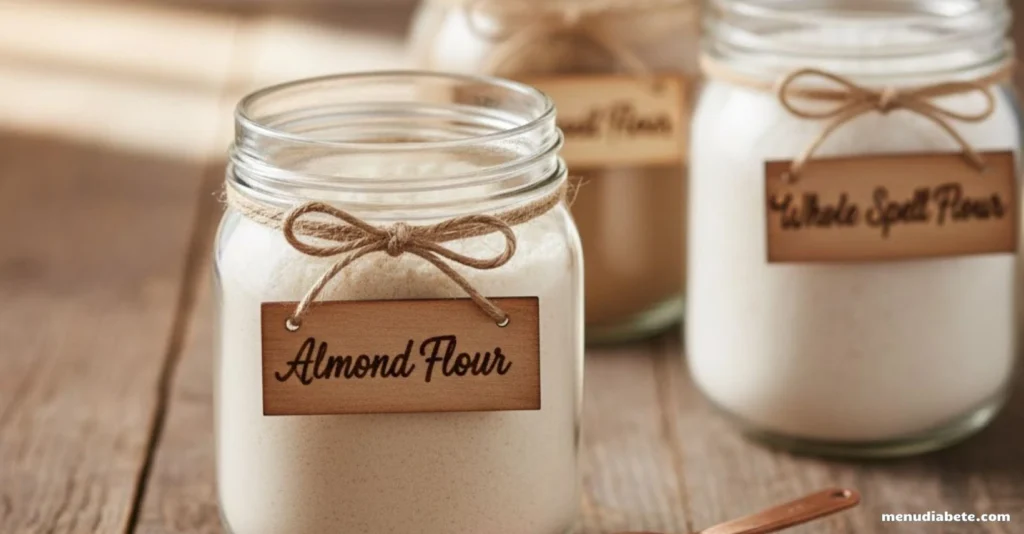 Pour le diabète de type 2, privilégiez les farines d’oléagineux (amande IG 15, noisette IG 20, coco IG 35) et les farines complètes de céréales anciennes (épeautre T150 IG 45, orge mondé IG 30, sarrasin IG 40). Évitez absolument les farines blanches raffinées (T45, T55) qui ont un IG supérieur à 70.