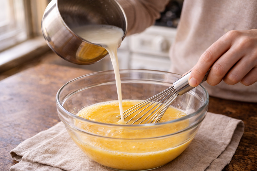 Pourquoi ? Si vous versez trop vite, vous allez cuire les œufs instantanément et obtenir une omelette sucrée bizarre (vécu, pas recommandé).